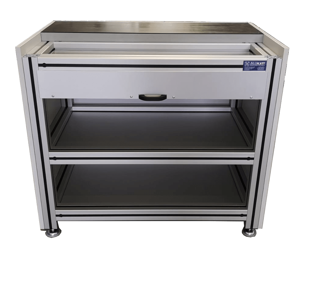 Aluminium-Tische von ALU-KATT Montagetechnik setzen sich aus Grundgestell und Arbeitsplatte zusammen. Gegebenenfalls wird noch ein Portal eingebaut. Höhe, Breite und Ausführung gestalten wir ganz nach Ihren Wünschen. Auf Wunsch können die Tische mit Zusatzelementen wie Fußstützen, Schubfachschränken und Schubfächern oder Halteschienen versehen werden.